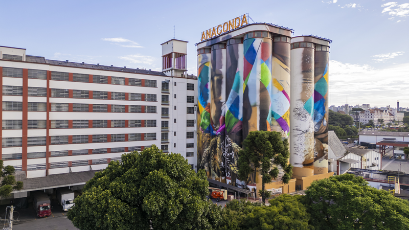 Intitulada “Ciclos”, a pintura ocupa 5 mil m2 nos dez enormes silos do Moinho Anaconda, no bairro Jardim Botânico. A obra, encomendada pela empresa em celebração aos seus 75 anos, ilustra três momentos da transformação do trigo em pão: a colheita dos grãos, o preparo da massa e o pão assado sendo oferecido.